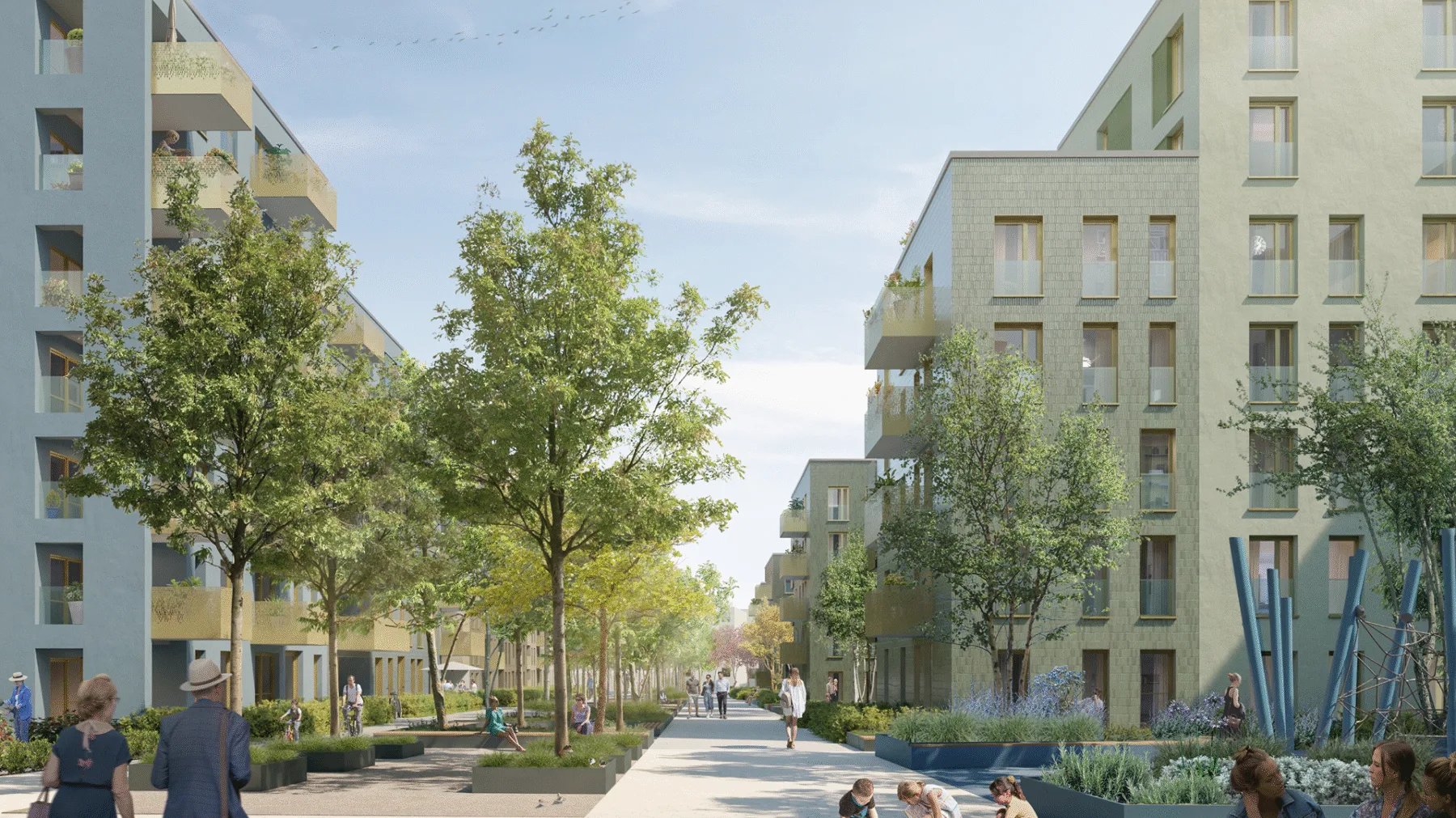 A central boulevard with community gardens, playgrounds, and a public square invites people to meet, relax, and connect.
